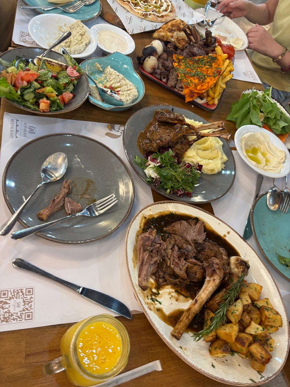 The spread at Al Farah is truly impressive, with a wide variety of classic Middle Eastern dishes served family-style. The table was filled with an abundance of dishes including succulent lamb with rice, various grilled meats, fresh salads, creamy hummus, and other traditional mezze. The presentation was both appetizing and authentic.