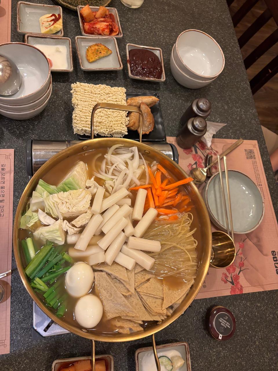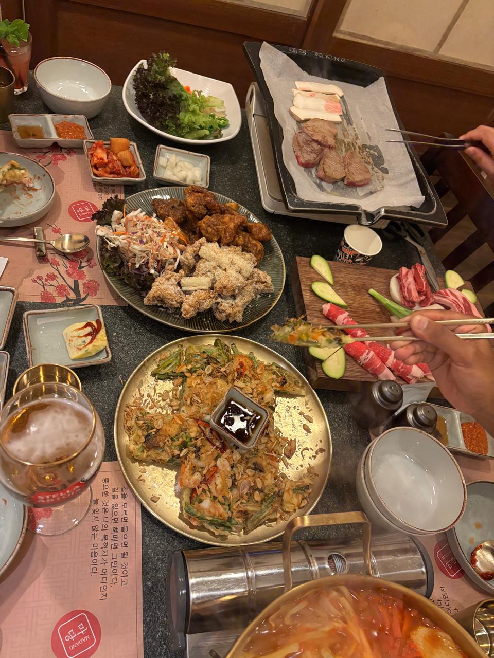 We ordered a variety of classic Korean dishes, including a bubbling hot pot filled with rice cakes, vegetables, and eggs, as well as perfectly fried Korean chicken with various coatings. The restaurant also offers premium cuts of meat for tabletop grilling, beautifully presented and accompanied by fresh vegetables and dipping sauces.